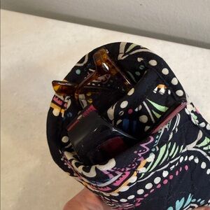 Vibrant quilted glasses case with a paisley design. Features a mix of colors including black, pink, blue, and yellow.