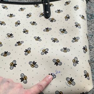 Beautiful authentic Coach reversible chalk white with all over bumble bee print on one side and solid black on reverse side. Absolutely lovely tote but has some flaws as noted below and as shown in pictures.