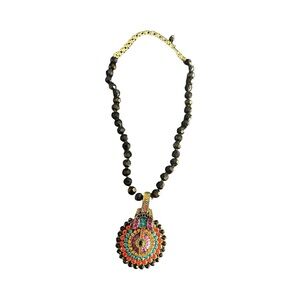 Heidi Daus Guilty Pleasure Beaded Crystal Magnetic Enhancer Necklace. It features a large, multicolored Art Deco-inspired pendant and a strand of black faceted beads, which can be worn together or separately.
