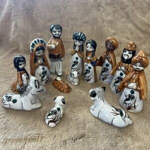 Vintage Mexican Tonala Nativity Set Scene 13 Piece Hand Painted Pottery Folk Art