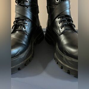 HIGH LOW-HEELED BOOTS IN BLACK. CROSSED STRAPS WITH BUCKLE DETAIL. POCKET AT FRONT WITH ZIP CLOSURE ON ONE BOOT. BACK PULL TAB. LUG SOLE. LACE AND INNER SIDE ZIP CLOSURE.