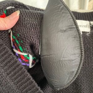 Vintage 80s black cardigan with vibrant floral designs. Velcro removable shoulder pads.