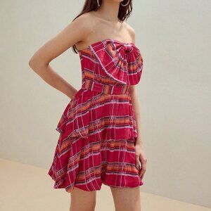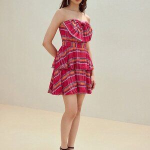 Elevate your style with this vibrant red boho dress, featuring a striking plaid pattern and charming bow decor. This strapless, mini-length dress boasts a regular fit and sleeveless design, perfect for making a statement. The tube silhouette and puffball details add a playful touch to this trendy, A-line cami dress.