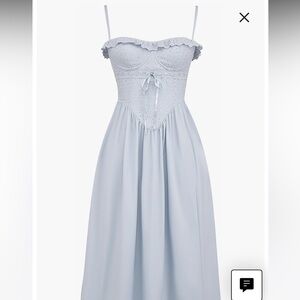 Chic light blue midi dress with lace details. Features a fitted bodice and flowing skirt.