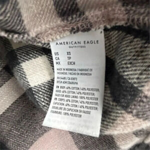 Keywords: American Eagle, flannel shirt, plaid, button-up, sherpa-lined, hooded, casual wear, fall fashion, unisex, multicolor, XS, pre-owned, long sleeve, collared, machine washable.