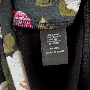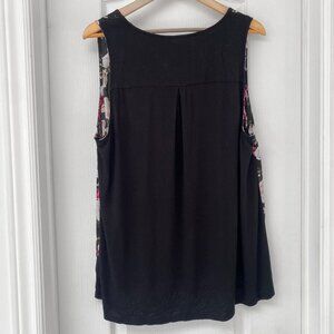 A knit-to-woven tank features a mixed fabric design with a floral georgette front and solid stretch-knit back so that you can looked polished all day and still feel super relaxed.