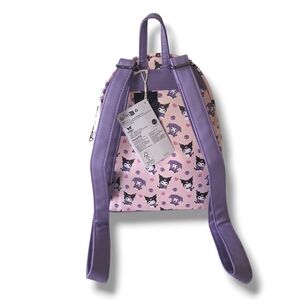 Keep your bag lookin' cozy and cute, just like Kuromi! This Sanrio mini backpack features an allover print of Kuromi in a cozy hoodie, plus hearts and skulls. Comes with front zipper pocket, interior drop pocket, adjustable straps and top carrying handle.