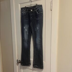 Cute boho baby flare distressed jeans with embellished back pockets. Giving a real Faith from Buffy vibe. Marked size junior 11, no flaws noted.