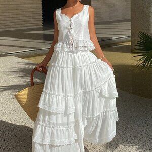 Elevate your casual wear with this white two-piece set, featuring a lined, sleeveless camisole top with a sweetheart neckline and a long, skirt bottom for a regular fit.