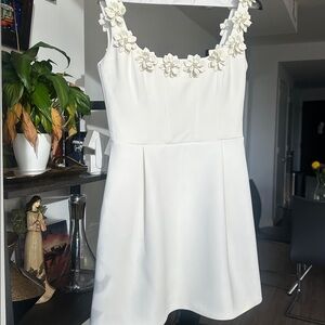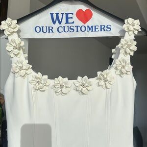 Nadine Merabi CINDY is a timeless , feminine mini dress crafted from white crepe fabric with large floral appliqués across the front and back of the square neckline. the Perfect for elegant occasions. Crafted by NADINE MERABI.