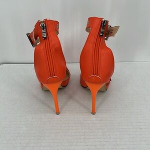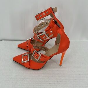 Super cute vibrant orange heels. They are a closed pointed toe style. They have a buckle design throughout. Strappy design with an ankle wrap. Back zipper for easy on & off. Very fun & on trend heels. Perfect for clubbing a party or any special occasion. Great used condition, only worn once have some minor scuffs on back but overall no major signs of wear.