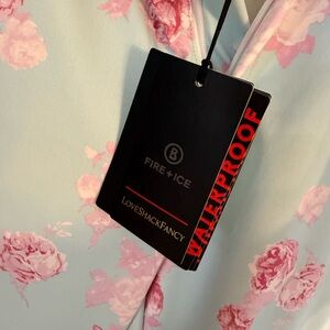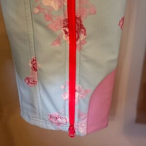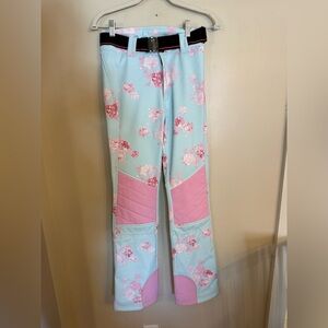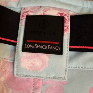 LoveShackFancy x Bogner Fire + Ice ZULA Ski Pants; Snowpants; Quiet Tide Blue with Pink Floral Print. Brand new with tags. Waist laying flat approximately 13:50; inseam approximately 29.5