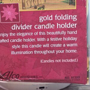 -Handcrafted by Litetyme (Alco Industries, No. 9130G) -Festive gold finish with reindeer, snowflakes, berries -Hinged panels for adjustable display -Holds 3 taper candles (included—new additions for instant use) -Original box included for that collector touch