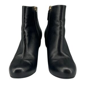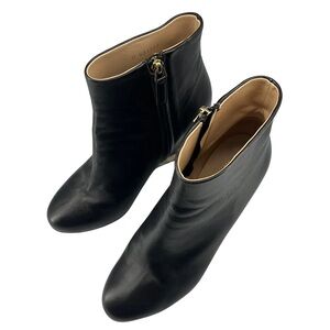 A timeless and ultra-wearable pair of Chanel black leather wedge ankle boots, crafted in Italy and finished with signature gold CC hardware along the heel. The sleek, sculpted wedge adds effortless height while remaining walkable and stable. A polished, minimalist silhouette that pairs seamlessly with denim, knitwear, dresses, and tailored looks year-round.