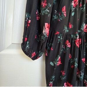 Chic black dress with colorful floral design. Features long sleeves and a flattering fit.