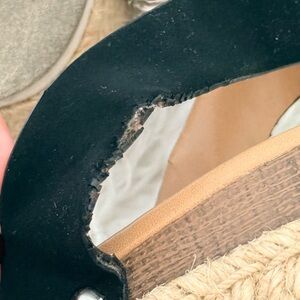 Black espadrilles with a platform sole. Features an adjustable ankle strap. Please see last picture of damage to strap. It’s hardly noticeable when you’re wearing and does not affect the wedges at all.