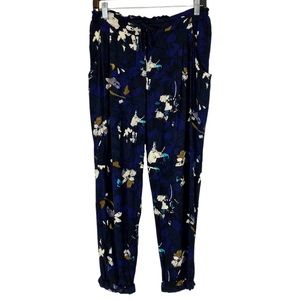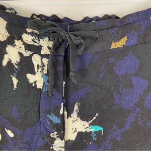 No size tags present, see measurement below, should fit a medium. Black with navy, cream, turquoise, purple, brown and possibly even more colours in a watercolour like floral print (quite abstract). Elasticized waist with adjustable tie detail. Button fly. Slant front pockets, quite large, no back pockets. Small Wilfred metal placket on the back. Seam detailing at the knees. Cuffed in a scrunchy, non perfect manner. Crepe like fabric, lightweight and beautiful drape! High rise. Cropped length.