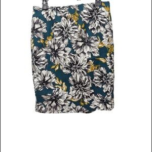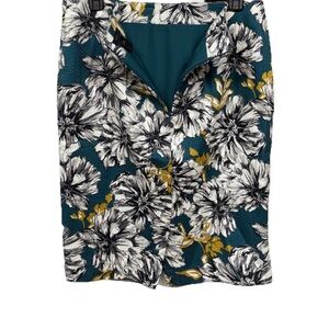 Elevate your professional or social wardrobe with this stunning Ann Taylor Factory floral pencil skirt. Featuring a rich teal background accented by bold black-and-white blooms and subtle mustard yellow foliage, this skirt is a standout piece for any season.