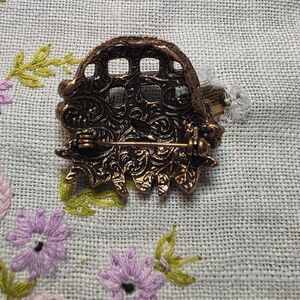 This exquisite brooch features a floral basket design with vibrant red, orange, and gold accents. Perfect for adding a touch of elegance to any outfit.