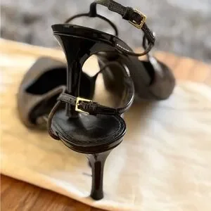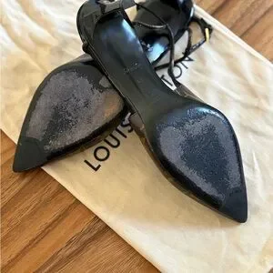 Elegant Louis Vuitton heels with iconic monogram pattern. Sleek black and brown design. Perfect for elevating any outfit.