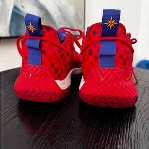 These shoes pay tribute to the Las Vegas club scene, incorporating heart and spade motifs reminiscent of casino carpets and using blue accents as a callback to James Harden's former team.