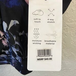 Nice floral V-neck bra with a blend of black and purple. There’s a vented net area in back, and it has a shelf bra—not padded. Medium to light activity. Premium activewear. Stylish and comfortable.
