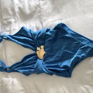 Chic blue one peice with gold accent by PatBO resort wear. Features a striking gold detail. Perfect for stylish comfort.