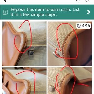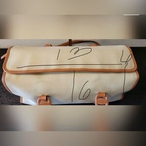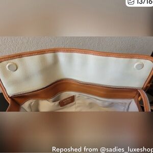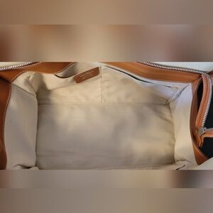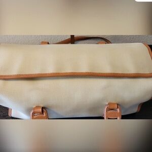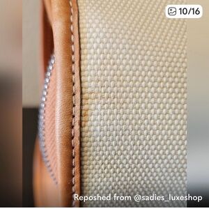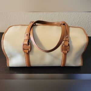 Elegant cream tote with tan leather accents. Features sturdy handles and classic design. Perfect for everyday use.