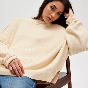 Beautiful Free People Easy Street Tunic in a soft cream knit. Designed with an intentionally oversized, relaxed silhouette, this piece works perfectly as a cozy sweater or lightweight tunic. Features a textured knit pattern, dropped shoulders, ribbed cuffs, and a longer length that pairs effortlessly with leggings, denim, or layered over a slip dress.