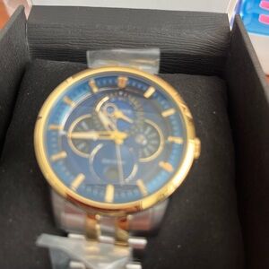 Features a stunning blue dial, gold-tone bezel, and two-tone stainless steel bracelet. Still has protective plastic on bracelet and clasp. Stored in box.