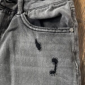 Stylish gray distressed jeans with a frayed hem. Perfect for casual wear.