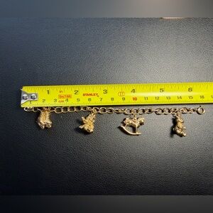 VTG 1973 Avon Gold Tone Child's Charm Bracelet (Bear, Skates, Rocking Horse, Doll)