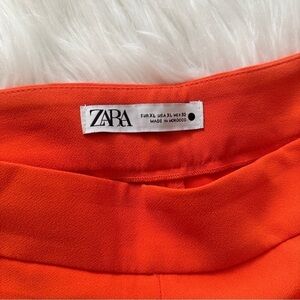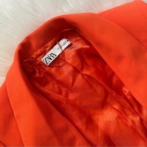 Stunning Zara two-piece tuxedo-inspired suit set featuring a structured shawl/tuxedo collar blazer with coordinating tailored trousers. The bold orange color makes this the perfect statement power suit for special occasions or elevated everyday style.