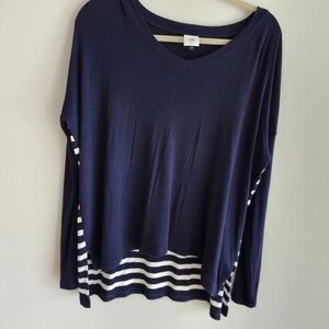 Perfect paired with jeans. Long sleeved navy high low shirt navy on the front side and striped on the back, designed by CAbi pre owned stain free pet free. beautiful condition