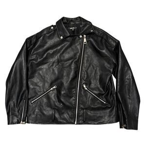Classic black faux leather moto jacket with asymmetrical zip front