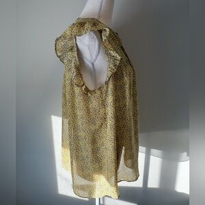 Bodyflirt yellow floral blouse in size 6. Features ruffle cap sleeves, V-neck with tie detail, sheer fabric, and pleat detailing across the top. Purple and green micro flower pattern adds a delicate touch.
