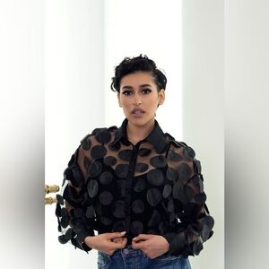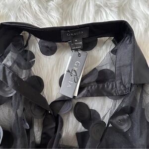 Mesh Splicing Round Polka Dots Button-Down Top, a chic and playful addition to your wardrobe.