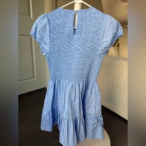 Elegant blue and white striped dress. Features delicate ruffle accents. Ideal for relaxed occasions.