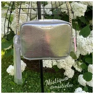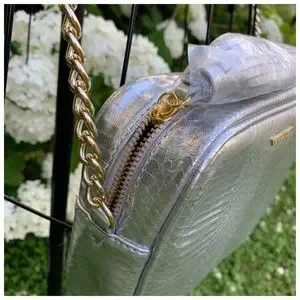 Details: VS Victoria’s Secret, Color: Gold, Silver, Angel Paris Fashion Show 2016, Bold Metallic Silver Snake (Python) Print Crossbody, Purse Limited Edition Gift Bag, 12” Top Zipper Closure, Black inside w/ Zipper Pocket, adorned with heavy Gold Chain. Gold Print Logo Front Top, and Tassel Zipper Pull.