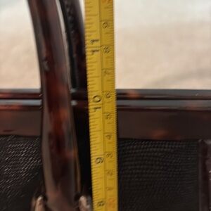 Formal looking tote made of thick black fabric with tortoiseshell trim snd handles. Very classy bag but a bit more formal than I have cause to wear, so I am re-poshing. Great for fall and winter wear! The bag is extremely well structured.