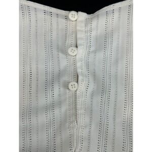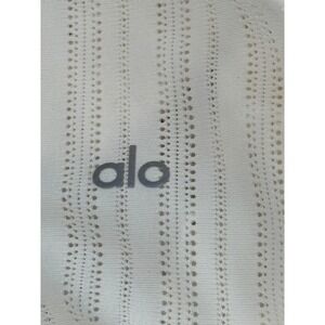 Elevate your activewear or everyday style with this chic Alo Yoga bodysuit. The crisp cream hue is beautifully accented by a delicate vertical perforated stripe pattern, offering a sophisticated texture and subtle breathability. A flattering mock neckline and long sleeves create a sleek silhouette, while the convenient snap closure at the gusset ensures a secure fit. This versatile piece is perfect for layering under a jacket for a night out, pairing with jeans for a casual yet polished look, or wearing to a yoga or pilates class.