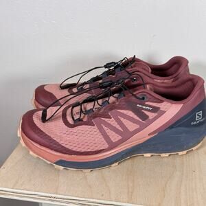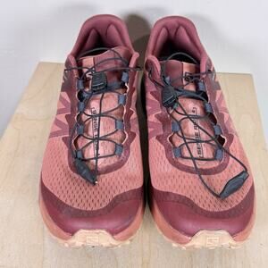Stylish Salomon athletic shoes. Burgundy upper with navy accents. Durable and comfortable for active wear.