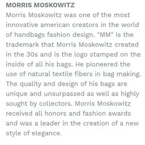 made in the 50's or 60's by Morris Moskowitz. genuine capeskin is an exceptionally soft durable & lightweight leather made from hair sheep whose ancestors were indigenous 2 S. Africa. the fine grain make this bag appear flawlessly smooth & poreless, & it's washable!