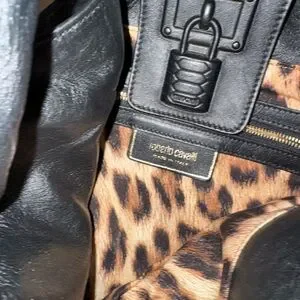 Chic Roberto Cavalli tote with zebra print laser cut leather. Features a bold pattern and secure flap closure.