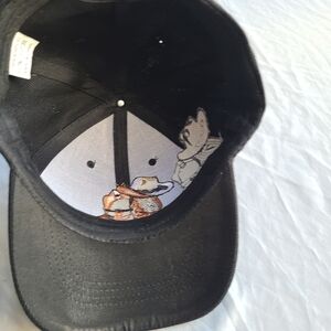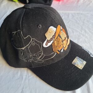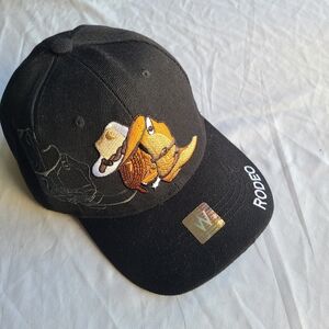 Step into the arena of style with this captivating black cap, an artifact of bold, playful expression. The intricate, textured embroidery of cowboy boots and Stetson offers a vintage aesthetic, while the "RODEO" script adds a touch of untamed spirit. It's more than an accessory; it's a statement piece for the free-spirited soul. Note some untreated dinginess on underside of the bill