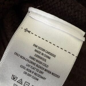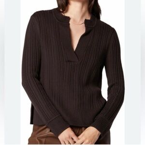 This is a rich chocolate brown ribbed knit sweater with a flattering split-neck / notch neckline. Made from 100% wool, it has a structured yet cozy feel that works perfectly for fall and winter layering.