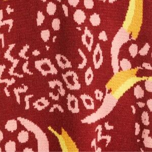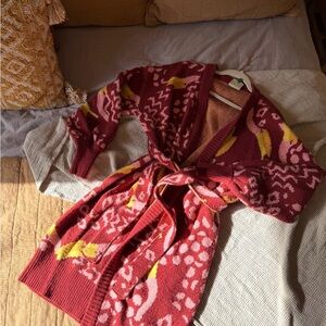 Bold cardigan with striking red and yellow design. Perfect for layering and adding flair.