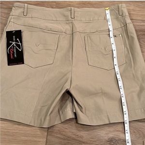 Rekucci khaki shorts in NWT condition. Decorative buttons, pull on (no zippers, etc), super stretchy material (rayon, nylon, spandex). Approximate measurements: 15” in length in front; 16” in back; 16” waistline laying flat (has more with stretch); approximately 19” hips (has a couple more inches with stretch). Front pockets, back pockets, belt loops. US size 12. First photos taken outdoors in natural lighting and best reflect color seen in person.