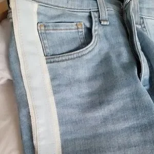 Features: light blue, high waist, crop, side stripe details, zip fly with button closure, pockets, raw hem, tuxedo stripes, high rise, 92%cotton, made in USA