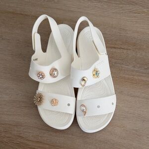 CROCS Brooklyn 4U Low Wedges White Sandals with Gold and Silver Charms Size 10